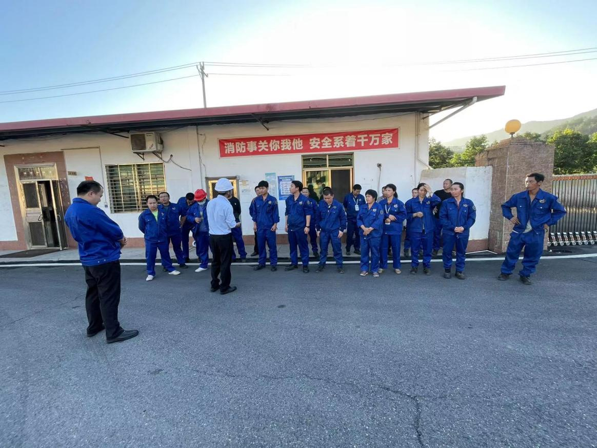 模擬員工宿舍突然起火,火勢發(fā)展迅猛并產(chǎn)生大量濃煙,通知每間宿舍內(nèi)人員進行撤離至廠區(qū)大門口安全地點,人員撤離時應(yīng)低頭彎腰、手捂住口鼻有序進行撤離。待所有人員撤離至安全地點時,清點人員。上報公司并撥打119進行報警。