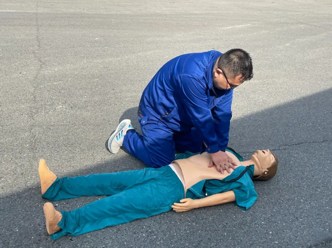 醫(yī)療救護組穿戴好防護用品,使用擔(dān)架抬出傷員,并進(jìn)行心肺復(fù)蘇。